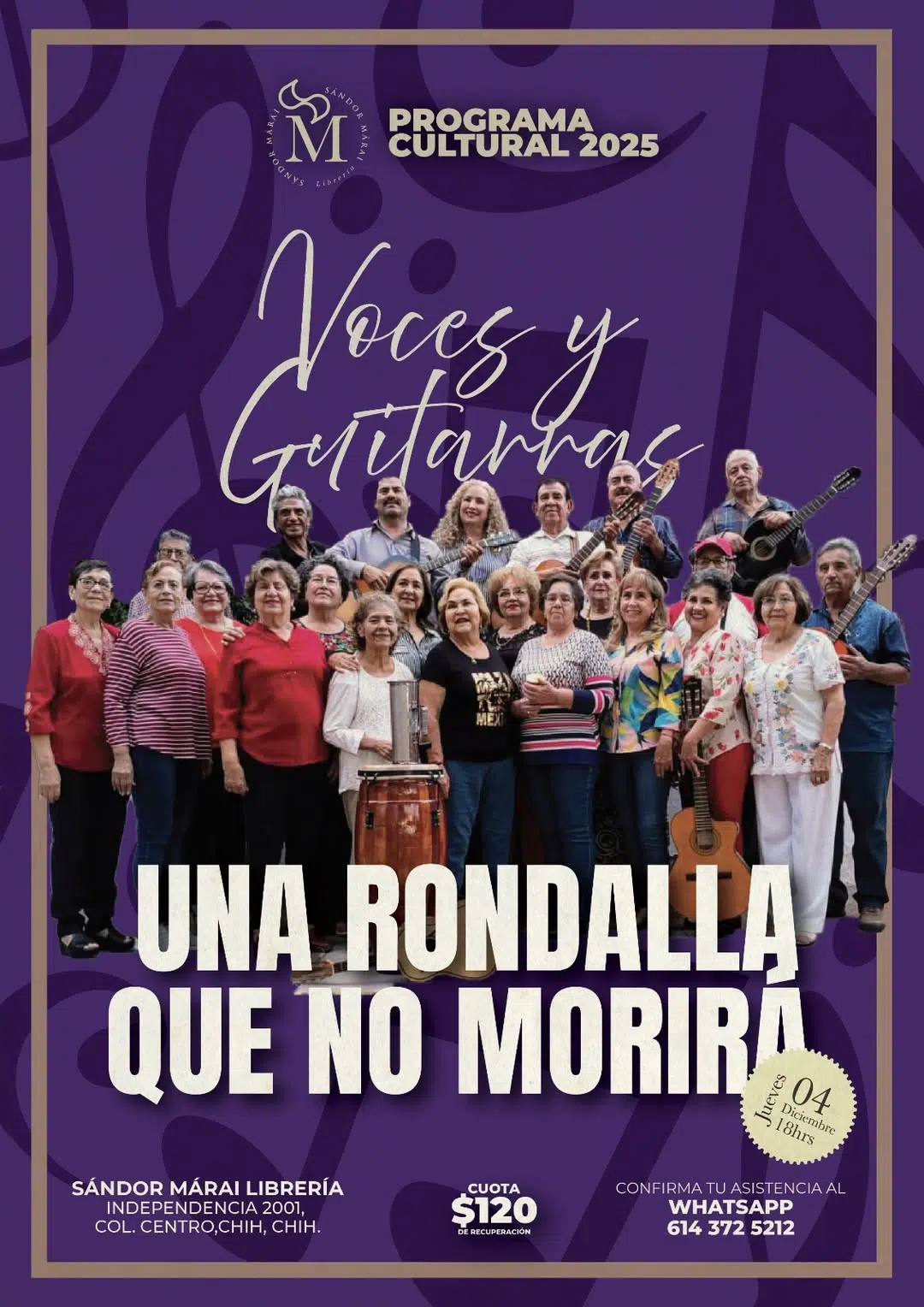 La querida Rondalla Voces y Guitarras se presenta en Sándor Márai Librería para cautivarnos con la fuerza y calidez de su música. Podrás disfrutar temas como Adiós amor, El andariego y Como quien pierde una estrella, interpretados con la misma pasión que ha sostenido la trayectoria de esta agrupación chihuahuense.